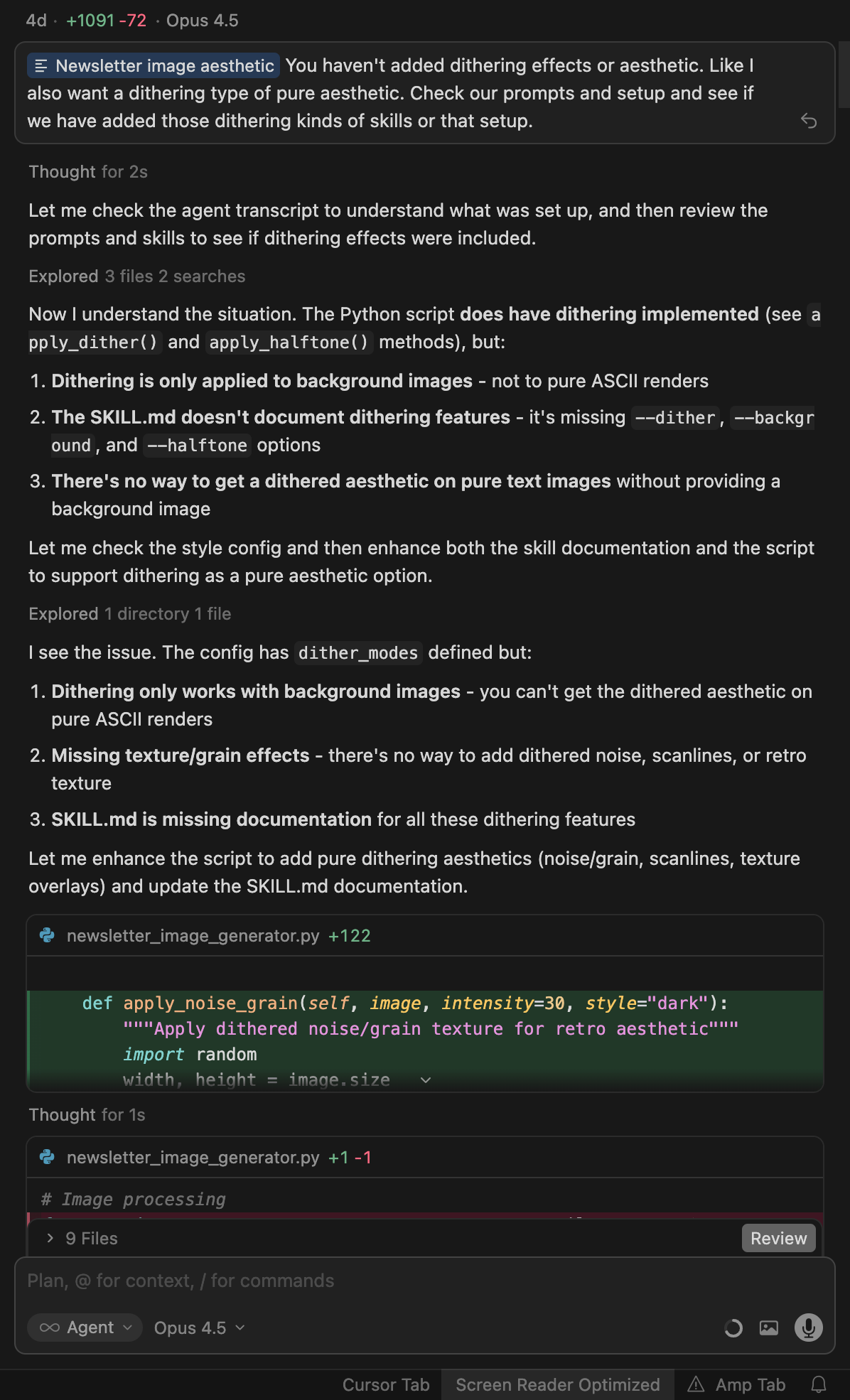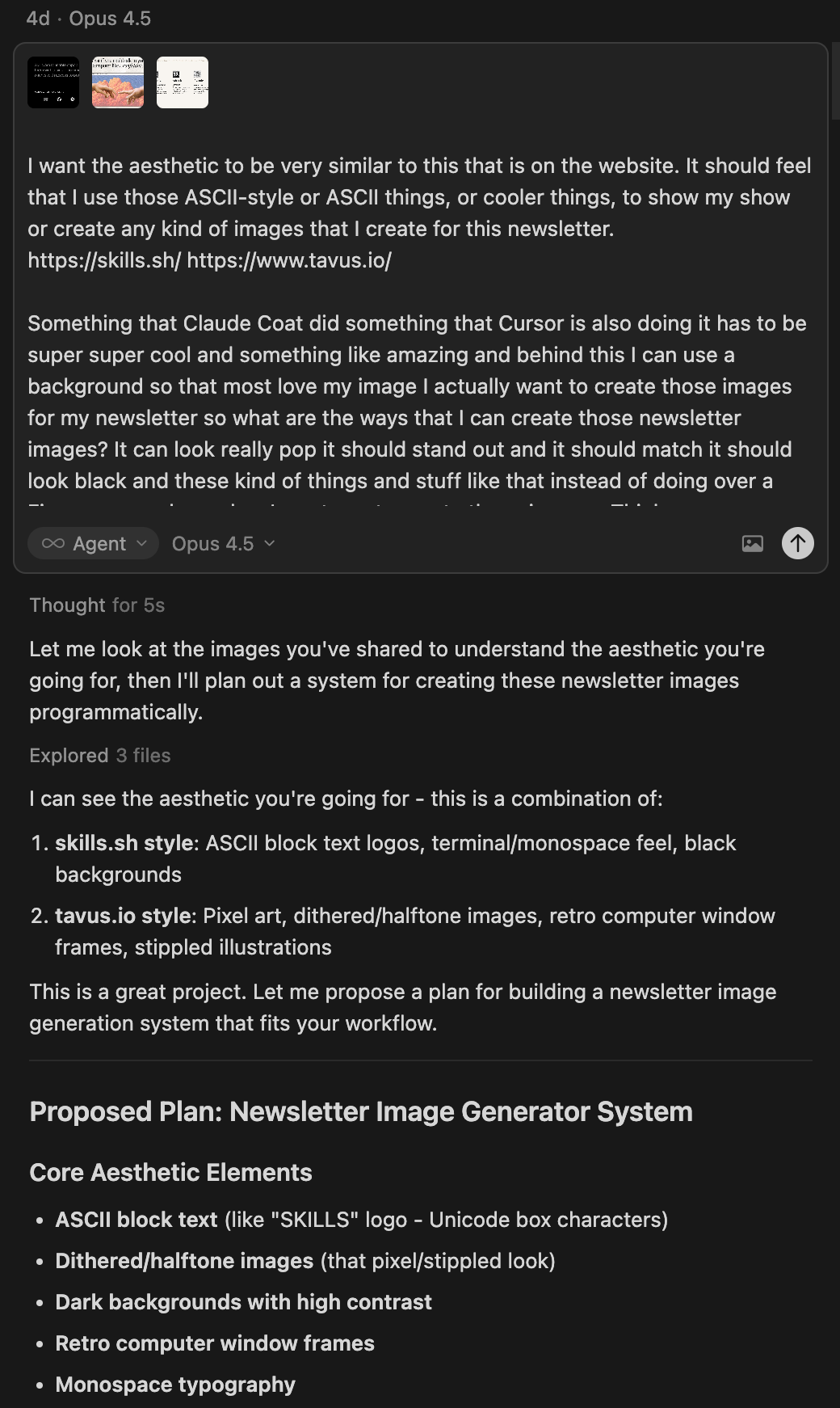The setup is super simple. I say “create a newsletter header for ABM WEEKLY with that retro dithered look” in Cursor. Python script generates Unicode block text, applies dithering, scanlines, grain, adds branding, outputs a 1200x630 PNG. No Figma, no Canva, no switching apps, I just stay in my editor.