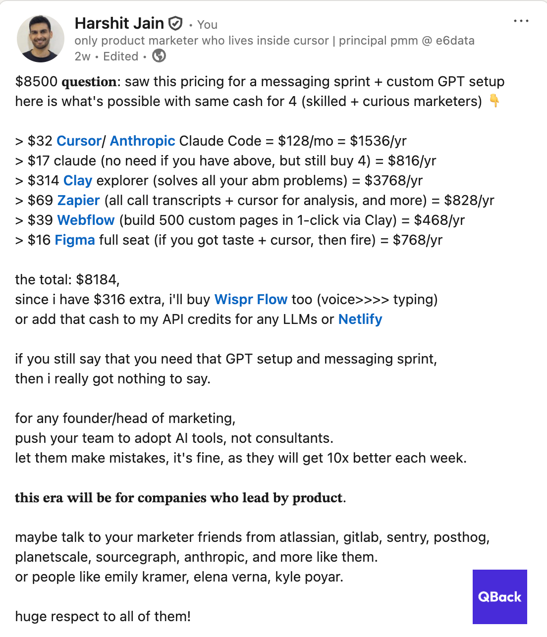 Content at Scale - Why hire a content marketer when you have the highest context about product + buyers + competitors? you can use existing tools to write programmatic SEO at scale. Use buyer calls to write blog content and LinkedIn posts for you. Like, all the blogs you see on this page is built on Cursor using public web data and reddit.