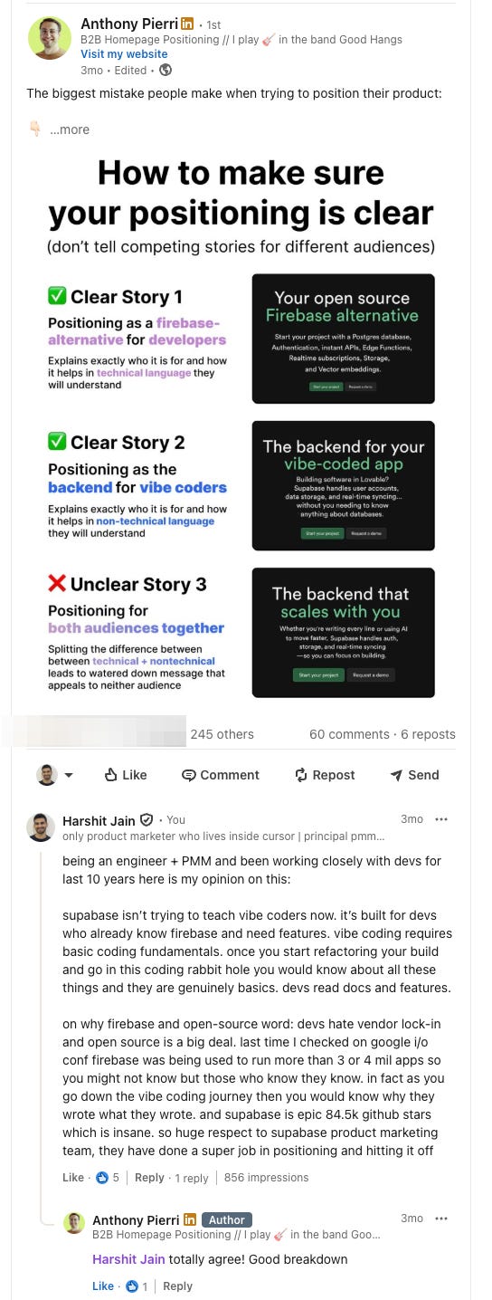 For dev tools, you need to go deep: example: If you’re at Supabase - how do people actually use it? What’s the database performance vs Firebase? How does authentication work differently?